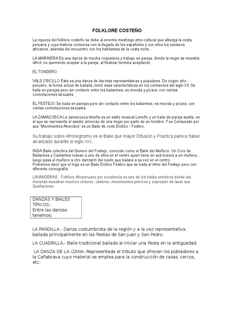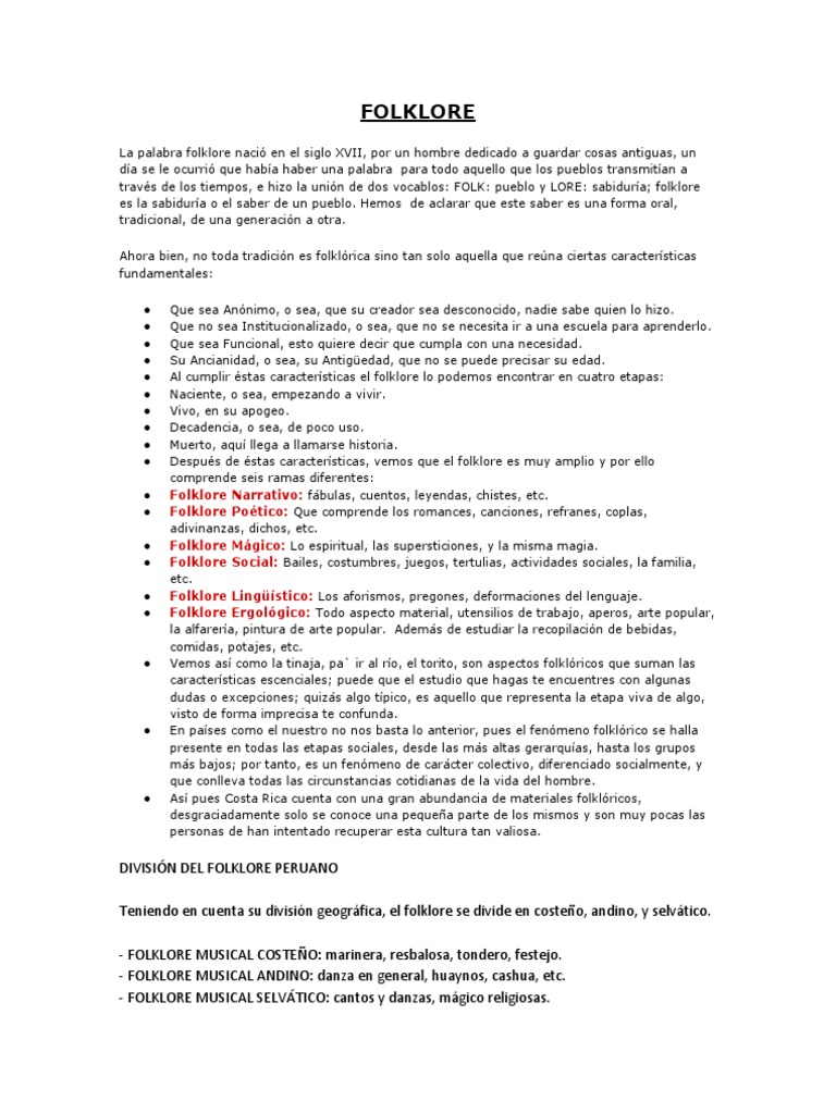 Folklore peruano características. La palabra folklore se implementó por primera vez el 22 de agosto de 1846. El folklore incluye una serie de manifestaciones culturales que incluyen la comida el vestido la música y las danzas. Historia del folklore en el perú. Caracteristicas del floklore peruano. Importancia del folklore como factor de identidad y desarrollo cultural. En argentina como paso en diversos países latinoamericanos como el caso de la cultura venezolana y cultura colombiana las raíces indígenas se mezclaron con los sonidos y sabores. Características del folklore argentino.